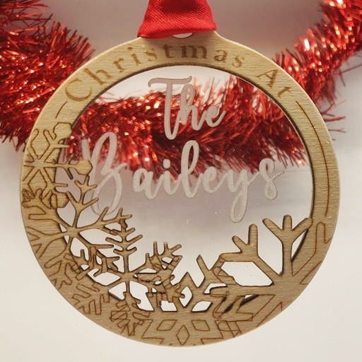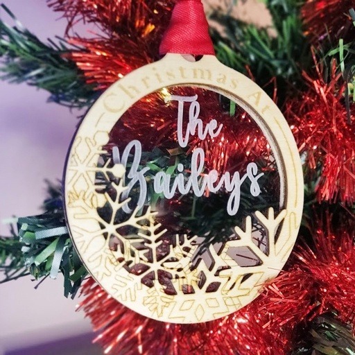 This bauble is perfect for that family that want something a little different….. why is it different ? because its 3 layers so not just laser cut but a window into the festive period with your family name at the centre.