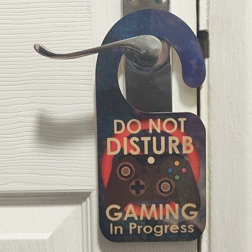 Gaming in Progress Hanger A simple no fuss sublimated Birch hanger ,  laser cut to hang on the outside of a door to make sure your not disturbed while Gaming