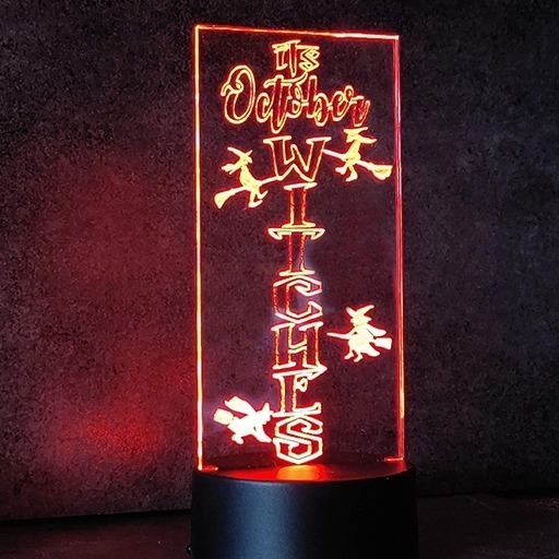 Neon Effect Edge lit October Witches, laser cut and etched and comes complete with the following