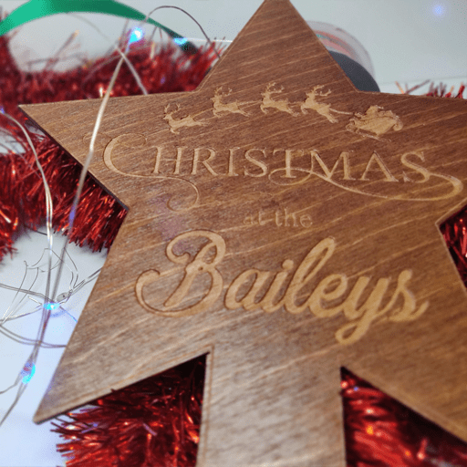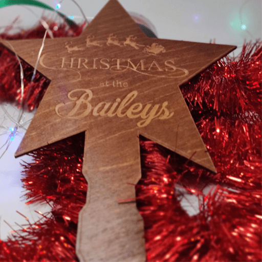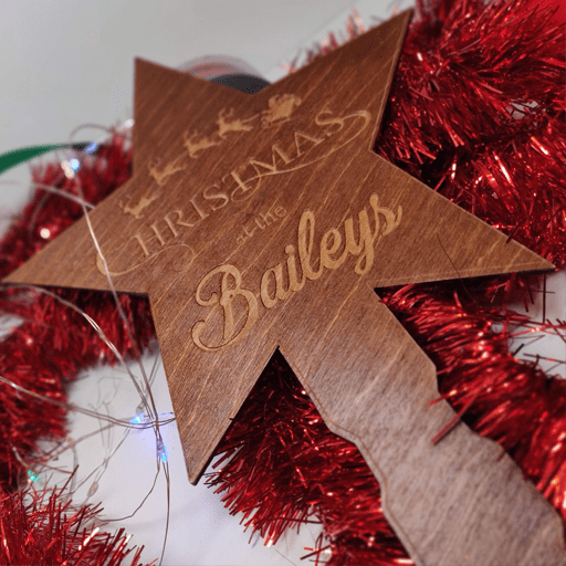 Our beautiful personalised Christmas tree topper is the perfect addition to your Christmas decoration collection! It can be personalised with a family name and made from Birch it is stained and varnished, With santa’s sleigh and reindeer flying above your personalisation. The toppers tie onto the top of your tree; you can do this using ribbon, rope etc(not included)