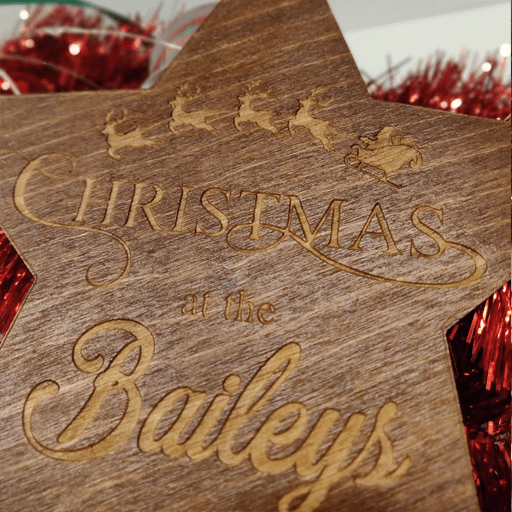 Our beautiful personalised Christmas tree topper is the perfect addition to your Christmas decoration collection! It can be personalised with a family name and made from Birch it is stained and varnished, With santa’s sleigh and reindeer flying above your personalisation. The toppers tie onto the top of your tree; you can do this using ribbon, rope etc(not included)