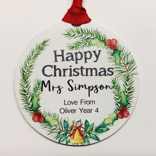 Made from laser cut hi-grade acrylic and UV printed with a Christmas Wreath, personalised with your teachers name, your message and finally the ribbon colour (red or green) then just leave the rest to us.