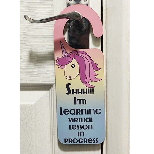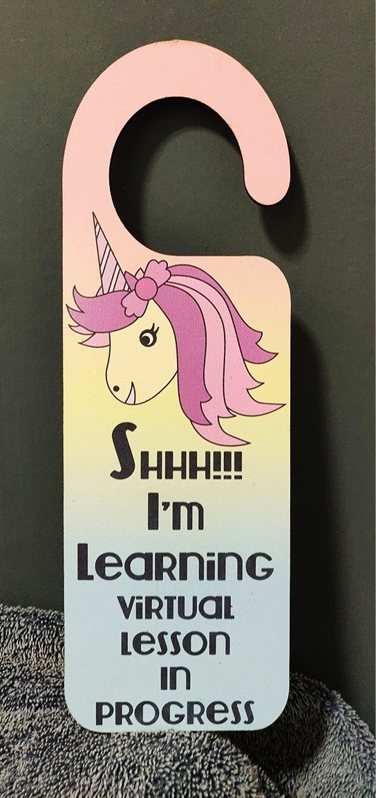 A sublimated hardboard hanger ,  laser cut to hang on the outside of a door to make sure your child isn’t disturbed while having an online lesson.