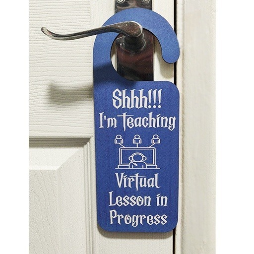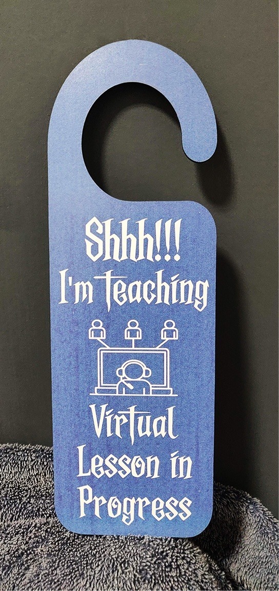 A sublimated hardboard hanger , laser cut to hang on the outside of a door to make sure your not disturbed while giving an online lesson.